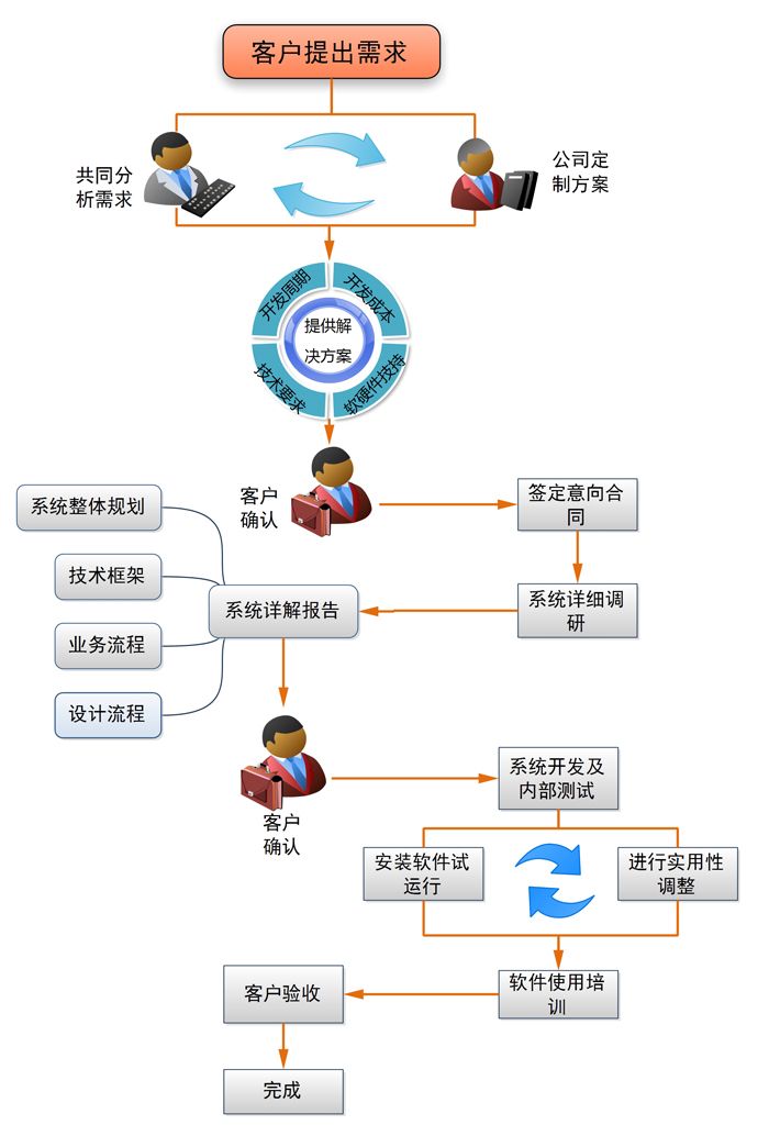 開 發(fā)過程將經歷獲取需求、需求分析、系統(tǒng)結構建立、軟件設計、代碼編寫、軟件測試等階段。 當軟件的后期測試完成后,通知業(yè)務需求人員驗收,驗收主要以業(yè)務 需求人員提供的原始資料及《軟件定制開發(fā)需求書》為依據,對軟件的各項功能進行全面的核查, 如無異議,驗收后簽署“驗收確認書”。項目組有義務對用戶提 供及時、有效、全面的培訓,并在項目實施過程中分重視對用戶方的技術轉移,并提前制訂有效可行的培訓計劃。