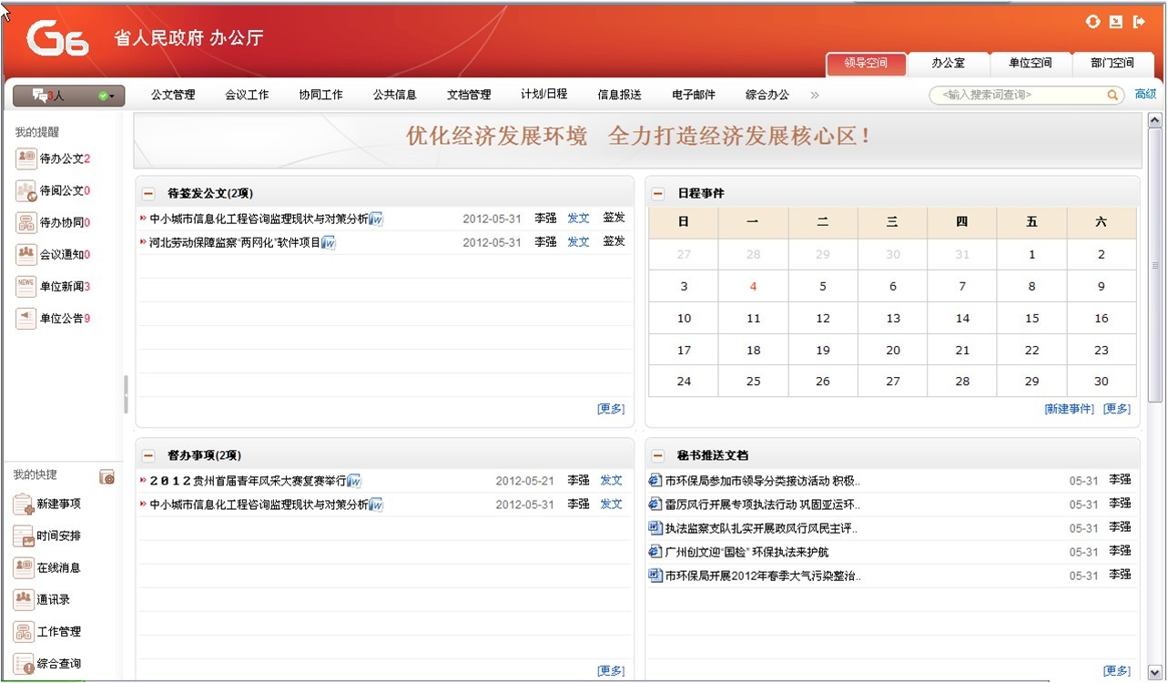 通過統(tǒng)一的用戶界面把系統(tǒng)中各個模塊的信息科學的、有機的展現(xiàn)出來,方便用戶第一時間了解自己待辦、待閱的各種公文、會議、通知、公告、新聞等。